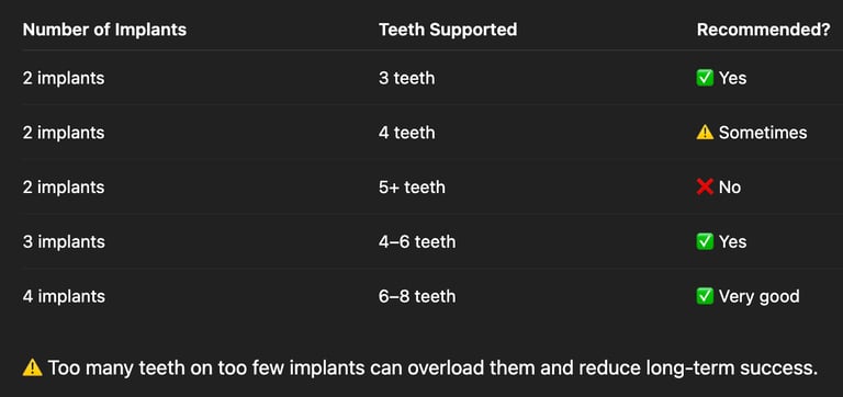 Es común colocar tres o cuatro dientes sobre dos implantes, pero soportar cinco o más dientes generalmente requiere implantes adicionales para evitar sobrecargas y complicaciones a largo plazo.